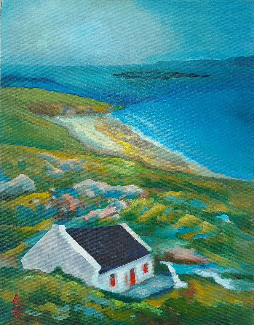 Aia Leu-Allin, a talented fine artist specializing in oil and watercolour painting, has made the scenic mountains near Kenmare, County Kerry, her home since 1989. Aia received her early training in figure sketching in Vevey, Switzerland, and she has a familial connection to the Swiss artist Eva Aeppli, her paternal grandmother. Aia’s paintings strive to capture the spirit of the landscape, blending reality with imagination. Her work often features not only the natural beauty of her surroundings but also whimsical elements like imaginary animals, symbols, and artifacts. This mix creates a unique and engaging world in her art.